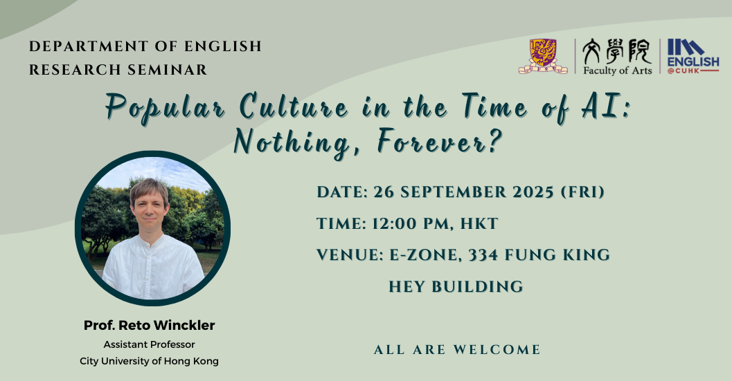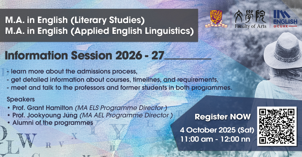 The past four years in the English Department at CUHK have provided a strong foundation for my early career as a researcher. I have enjoyed an exciting and fruitful journey, supported by a friendly, diverse, and academically rigorous environment. I have met many wonderful people, read a great variety of literature, and found great fulfilment in my studies. I am deeply grateful to all of the professors and faculty members for their support and kindness.